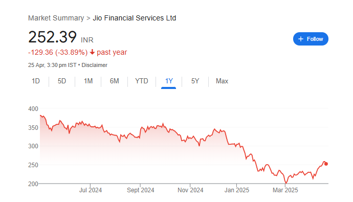 Jio Financial Services Limited (JFSL) is a prominent Indian financial services company, established in 1999 and headquartered in Mumbai. Originally a part of Reliance Industries, JFSL was demerged and listed independently on Indian stock exchanges in August 2023. The company operates through various subsidiaries, including Jio Finance Limited, Jio Insurance Broking Limited, Jio Payment Solutions Limited, and Jio Payments Bank, offering a comprehensive range of financial products and services. Jio Finance Share Price on NSE as of 26 April 2025 is 252.39 INR.